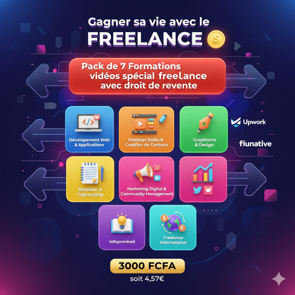 🔥 Découvre l’univers du Freelance qui paye en 2025 ! Avec cette formation à seulement 3000 FCFA, tu vas apprendre : 💻 Développement Web & No Code → Crée des sites modernes sans coder. 🎨 Design Graphique & Canva Pro → Réalise des visuels pros qui attirent l’œil. 📝 Rédaction Web & Copywriting → Écris pour vendre et capter l’attention. 📊 Marketing Digital & Gestion des Réseaux Sociaux → Attire des clients et fais grandir une audience engagée. 📹 Montage Vidéo & YouTube → Transforme tes vidéos en contenu viral. 🖌️ Illustration & Création visuelle IA → Exploite l’IA pour booster ta créativité. 💼 Assistance virtuelle & Gestion clients → Propose tes services aux entreprises du monde entier. 👉 En bref : tu repars avec des compétences réelles, monétisables immédiatement, pour générer des revenus en ligne. 🚀