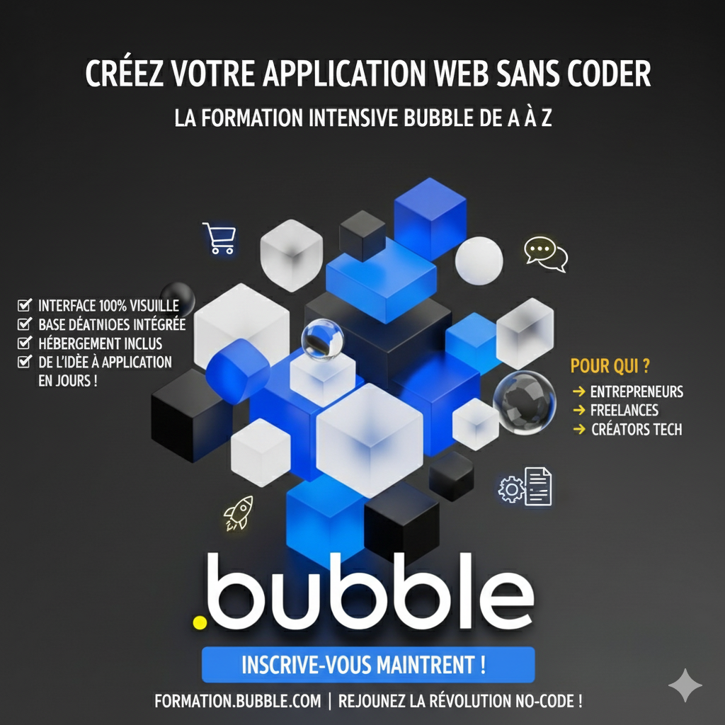 🔥 Créez votre Application Web de A à Z sans coder avec Bubble ! 🚀 Vous avez une idée brillante 💡 mais pas de compétences en programmation ? Pas de panique ! Avec Bubble, vous pouvez transformer votre imagination en application web professionnelle sans écrire une seule ligne de code 😍. ✨ Ce que vous pouvez faire avec Bubble : ✅ Créer une marketplace comme Airbnb ou Amazon ✅ Lancer un réseau social comme Facebook ou LinkedIn ✅ Développer un SaaS ou un outil de gestion pour votre business ✅ Concevoir des apps uniques et sur-mesure 🚀 Avec son interface 100% visuelle, sa base de données intégrée et son hébergement inclus, Bubble est la solution idéale pour : 👉 Les entrepreneurs qui veulent tester une idée rapidement 👉 Les freelances qui veulent élargir leurs services 👉 Toute personne qui rêve de lancer un projet tech sans coder 💻 💥 Résultat : Vous pouvez passer de l’idée à la mise en ligne en quelques jours seulement ! ⚡ C’est le moment de prendre de l’avance et de lancer votre projet digital sans attendre.