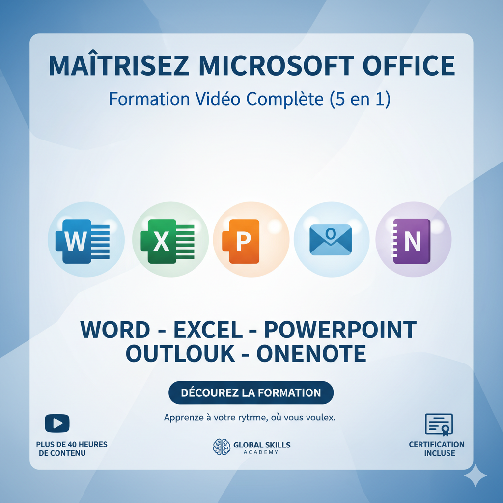 🔥 Deviens un PRO de Microsoft Office avec notre Formation 5 en 1 🔥 🚀 Tu veux maîtriser les logiciels les plus utilisés au monde ? Cette formation vidéo complète est faite pour toi 👇 ✨ Au programme : ✅ Word 📝 : Documents pros, mise en page et astuces cachées ✅ Excel 📊 : Tableaux dynamiques, formules et automatisations ✅ PowerPoint 🎤 : Présentations modernes et percutantes ✅ Outlook 📩 : Gérer tes mails & ton temps comme un pro ✅ OneNote 🗒️ : Prendre des notes et organiser tes projets efficacement 👉 En une seule formation, tu passes de débutant à expert, et tu gagnes un temps fou dans tes études, ton business ou ta carrière 💼 🎯 C’est l’outil parfait pour : Étudiants 📚 Entrepreneurs 💡 Freelancers 💻 Salariés ambitieux 🚀 Ne laisse pas passer ta chance, la maîtrise de Microsoft Office est un atout indispensable aujourd’hui ✅ ⚡ Rejoins la formation maintenant et change ton quotidien ! ⚡